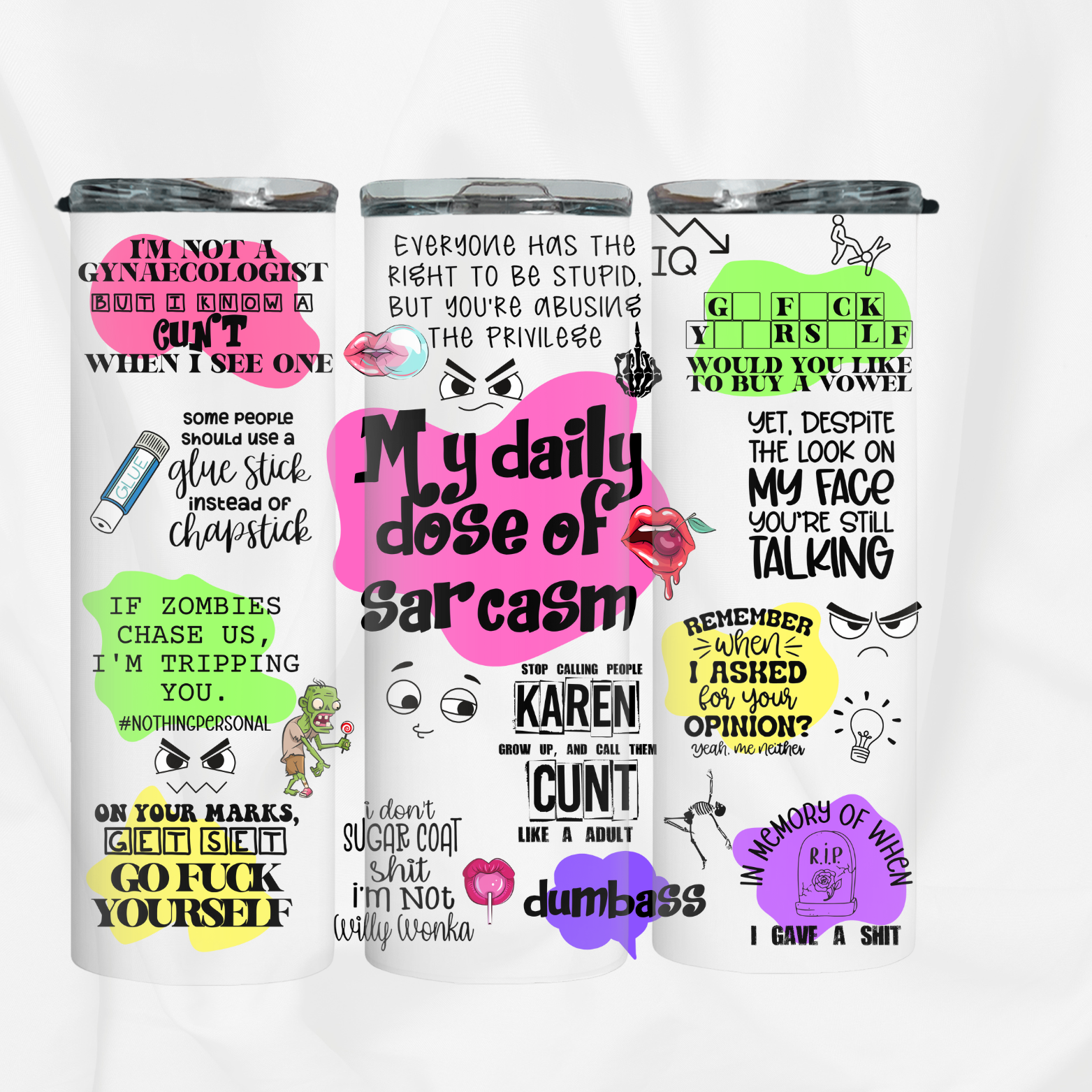 Get your daily dose of sarcasm with our tumbler! Perfect for keeping your drinks hot or cold while also providing a daily dose of humor. Take it on the go and spread the joy (or sarcasm) wherever you are. Cheers to staying caffeinated and witty!
