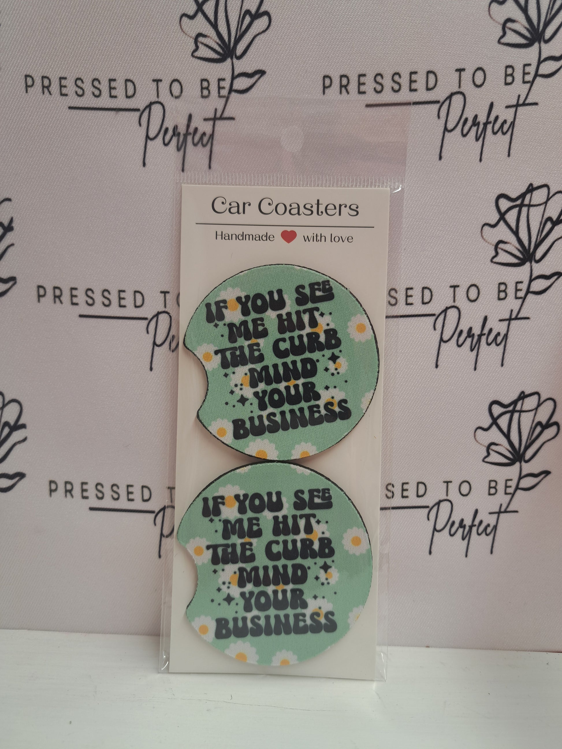 Protect your car from spills and potential damage with Mind Your Business! car coasters. These coasters are designed to fit in your cup holder, keeping your car clean and your drinks secure. Made with high-quality materials, these coasters are a must-have for any car owner.