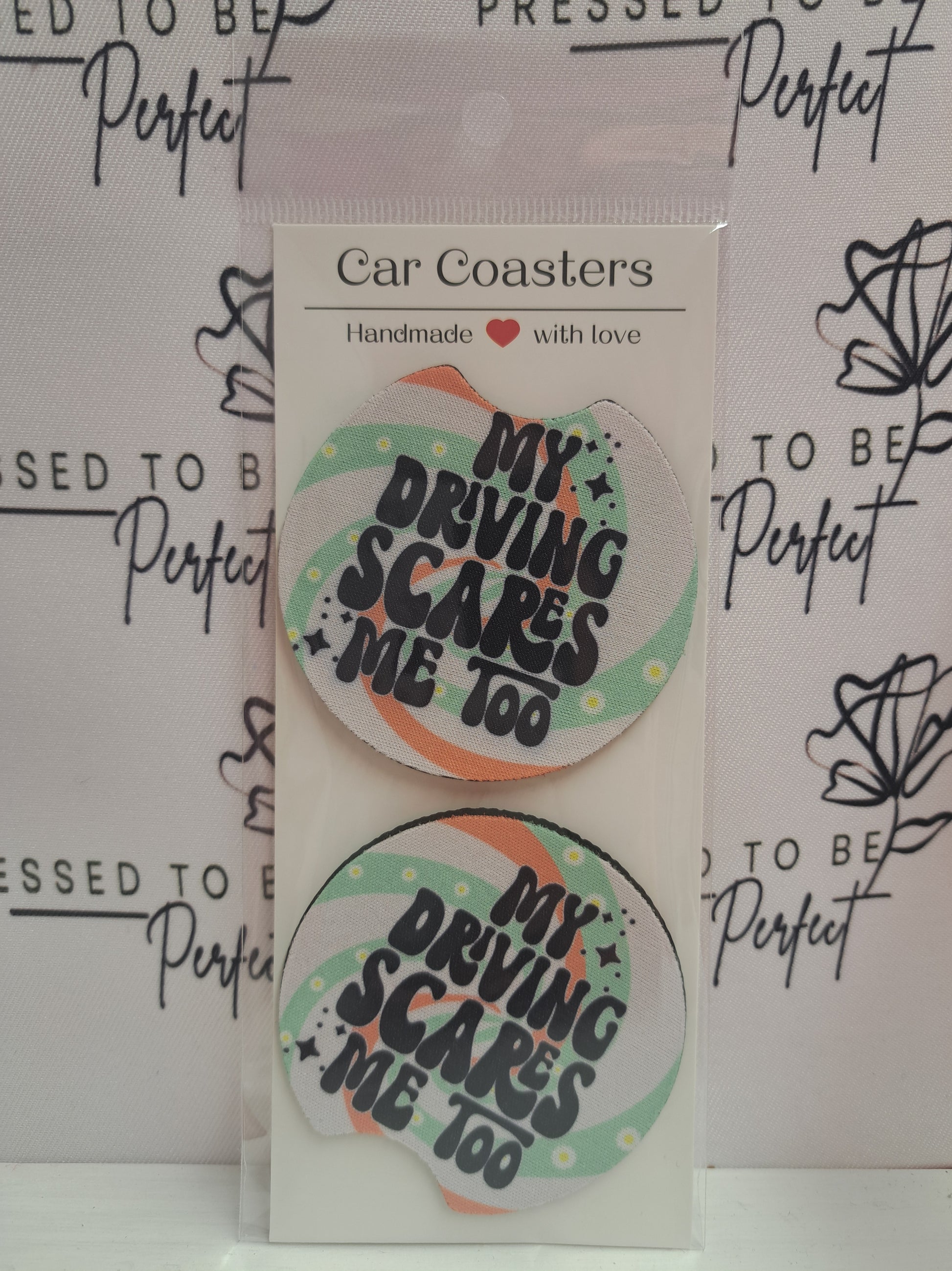Easily keep your car cup holder clean and dry with My Driving Scares Me Too! car coasters. Made with durable materials, these coasters absorb moisture and protect your cup holder from spills. Perfect for any car enthusiast, they also make a great gift for family and friends.